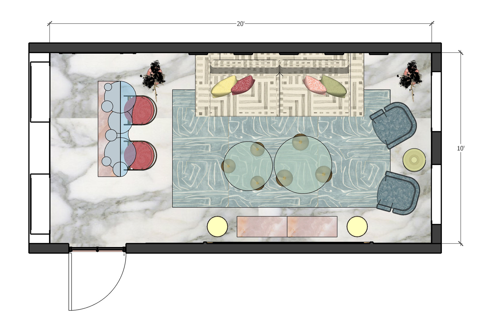 PROJECT PROMPT: A celebrity has approached you to re-design the living room in their casita. A casita is a small guest house, commonly found in the Palm Spring, CA area. The living room is 10’ x 20’ and must have at least one couch, one chair, coffee table and tv. The client has requested that at least 6 people should sit comfortably in the living room. The client wants it to be a welcoming and comfortable space for friends and family when they visit. It is required that one wall be a “point of interest” that